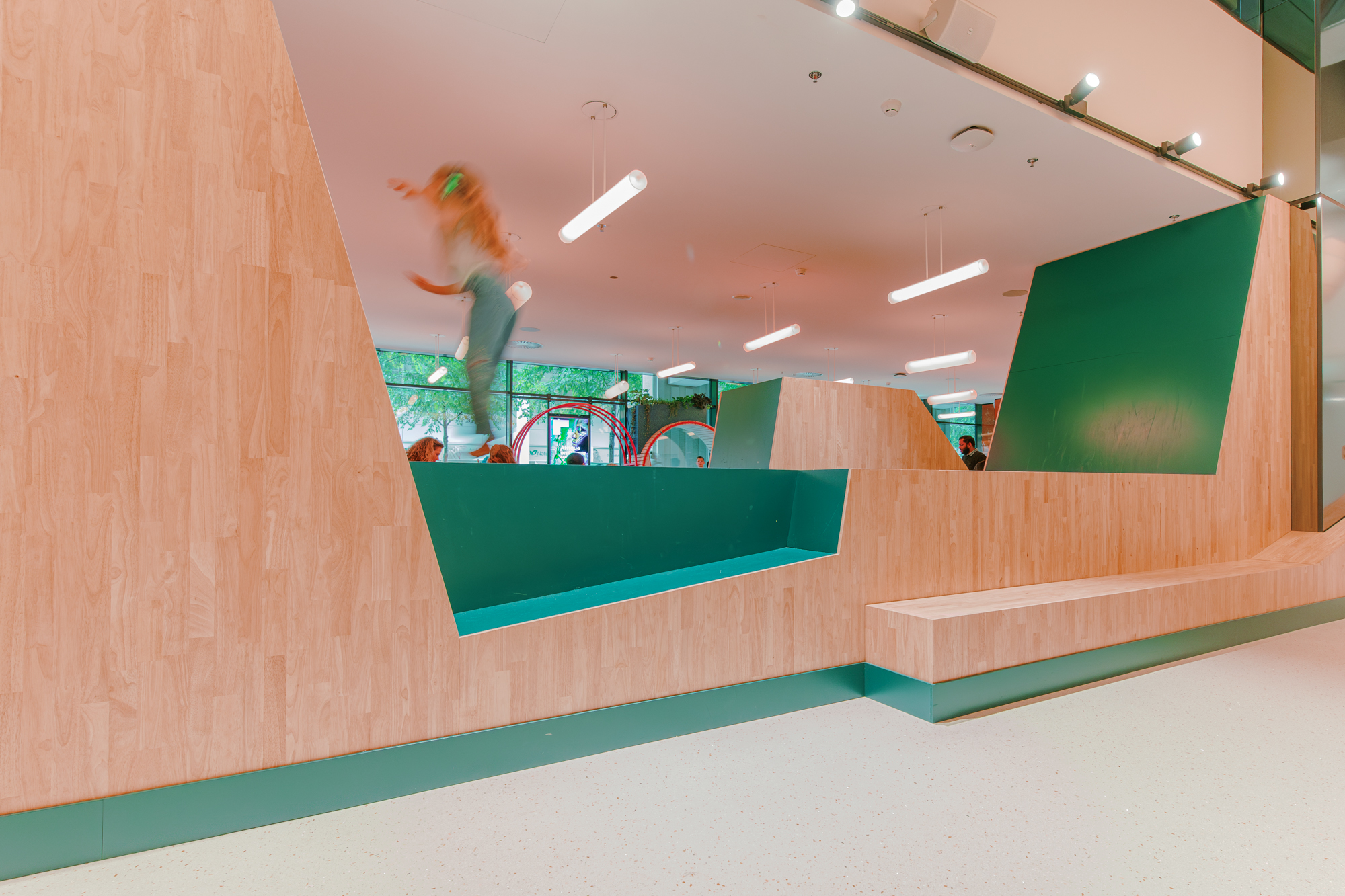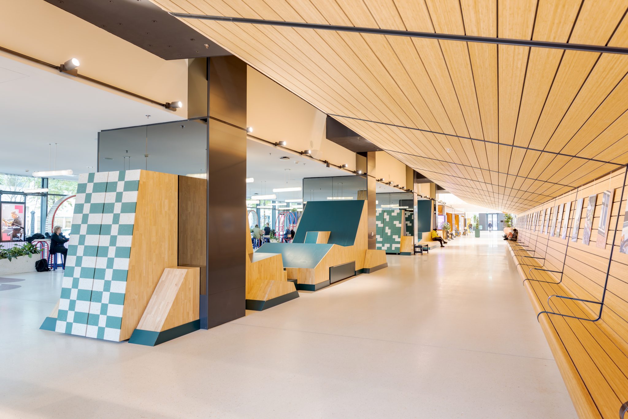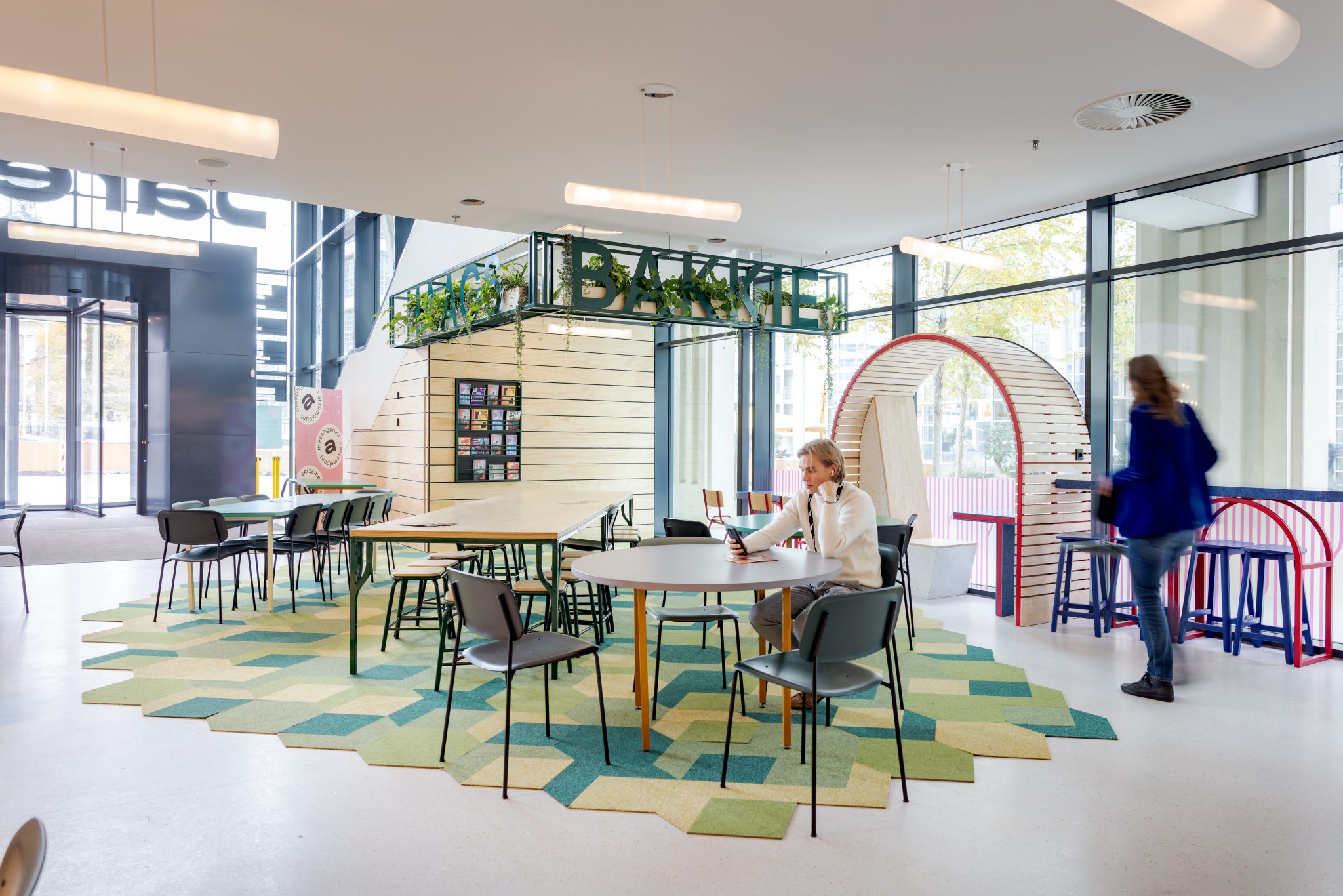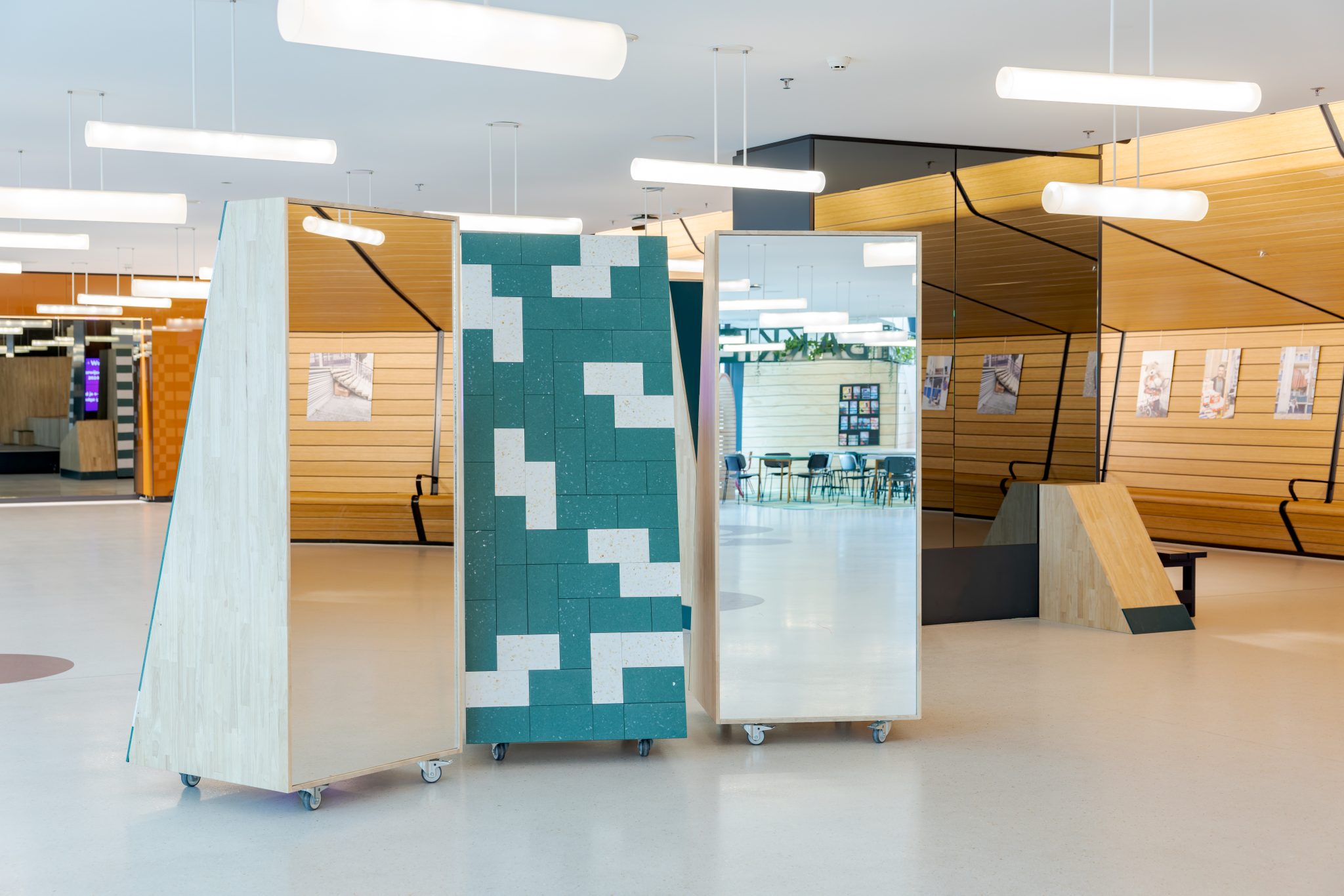 In het gehele project hebben we geprobeerd ook duurzamere keuzes te maken, zo werken we met rubberwood ( gemaakt van rest producten van rubberbomen) , polygood plaatmateriaal ( 100% gerecycled kunststof plaatmateriaal) en hebben we de circulaire WAE vloertegels gebruikt bij het Haagsbakkie. Uiteraard is het ontwerp niet volledig circulair maar veel elementen kunnen in de toekomst vrij gemakkelijk worden gedemonteerd en ingezet worden op een nieuwe locatie.