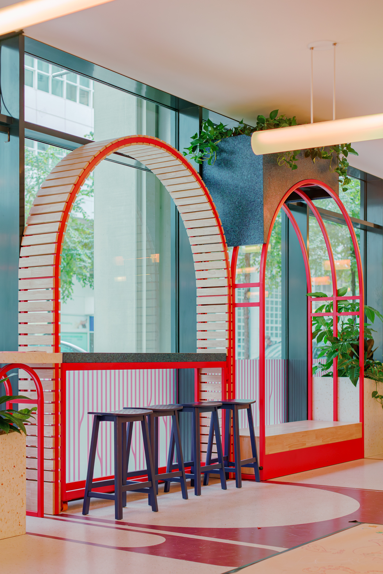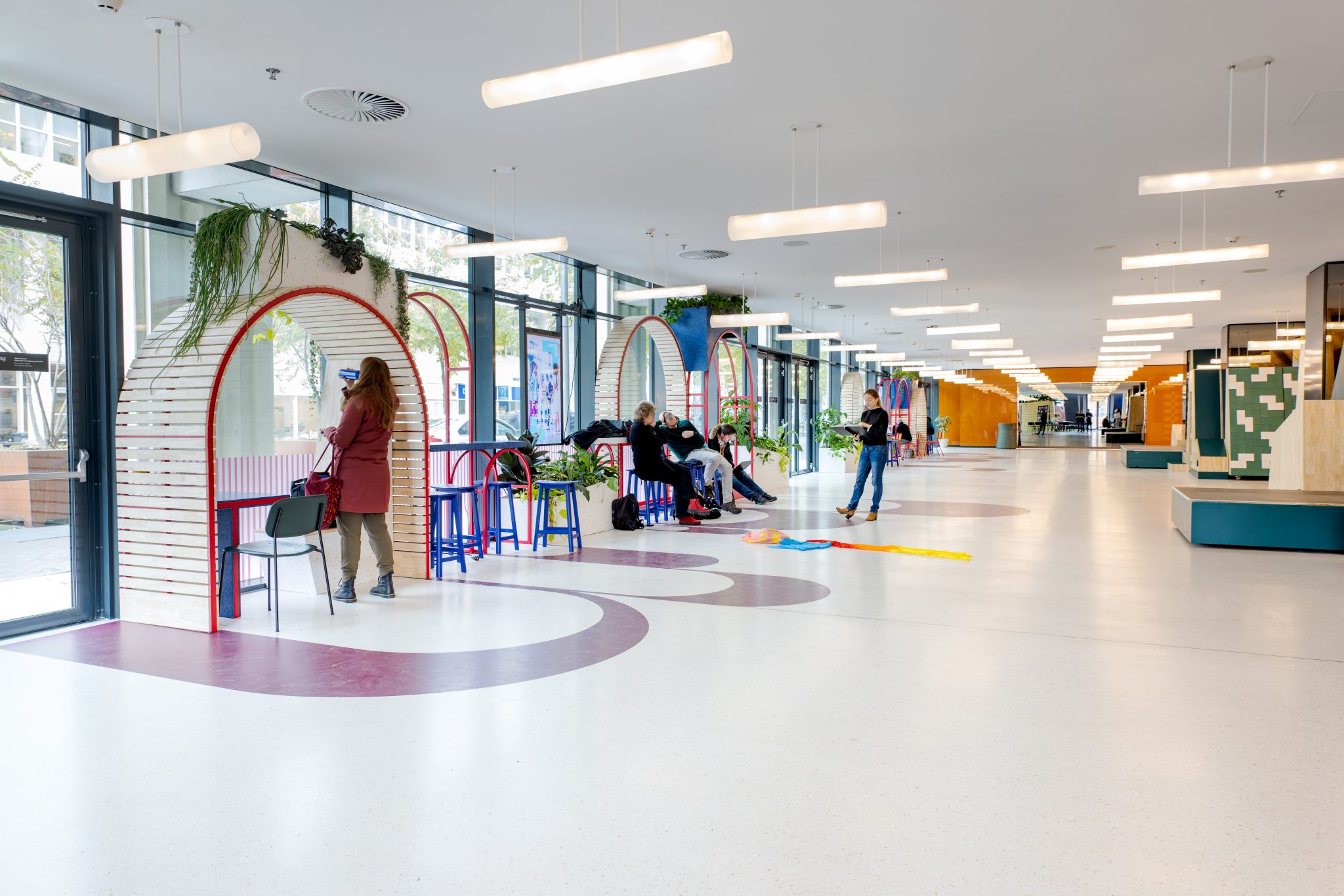 Het tweede beeld bepalende element is het raammeubilair. Een onderdeel dat overdag de geborgen plek moet geven aan bijvoorbeeld studenten om te gebruiken als fijne werk en studeerplek. Met de ronde en dynamische vormen taal van het meubilair en de bestickering halen we het repetitieve karakter van de plint weg en voegen we daarbij ook nog extra groen en kleur toe aan de grijze,kale en kille plek die het was.