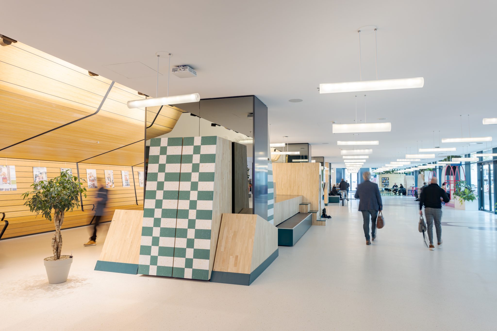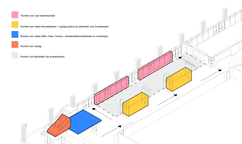 In opdracht van Triomf heb ik samen met David Hunneman & Rinke Wils mij bezig gehouden met het ontwerp van het Kunstenplein in Cultuurgebouw Amare. Amare is het nieuwe cultuurgebouw in Den Haag waar het Residentie Orkest, het Nederland Dans theater en het Koninklijk Conservatorium zich huisvestingen. Naast deze organisaties hebben ze ook een Open Amare programma wat als doel heeft een toegankelijke programma te zijn voor alle inwoners van Den Haag. Het Kunstenplein op de beganegrond is onderdeel van dit programma dat als ” thirdplace” moet gaan fungeren in de stad.