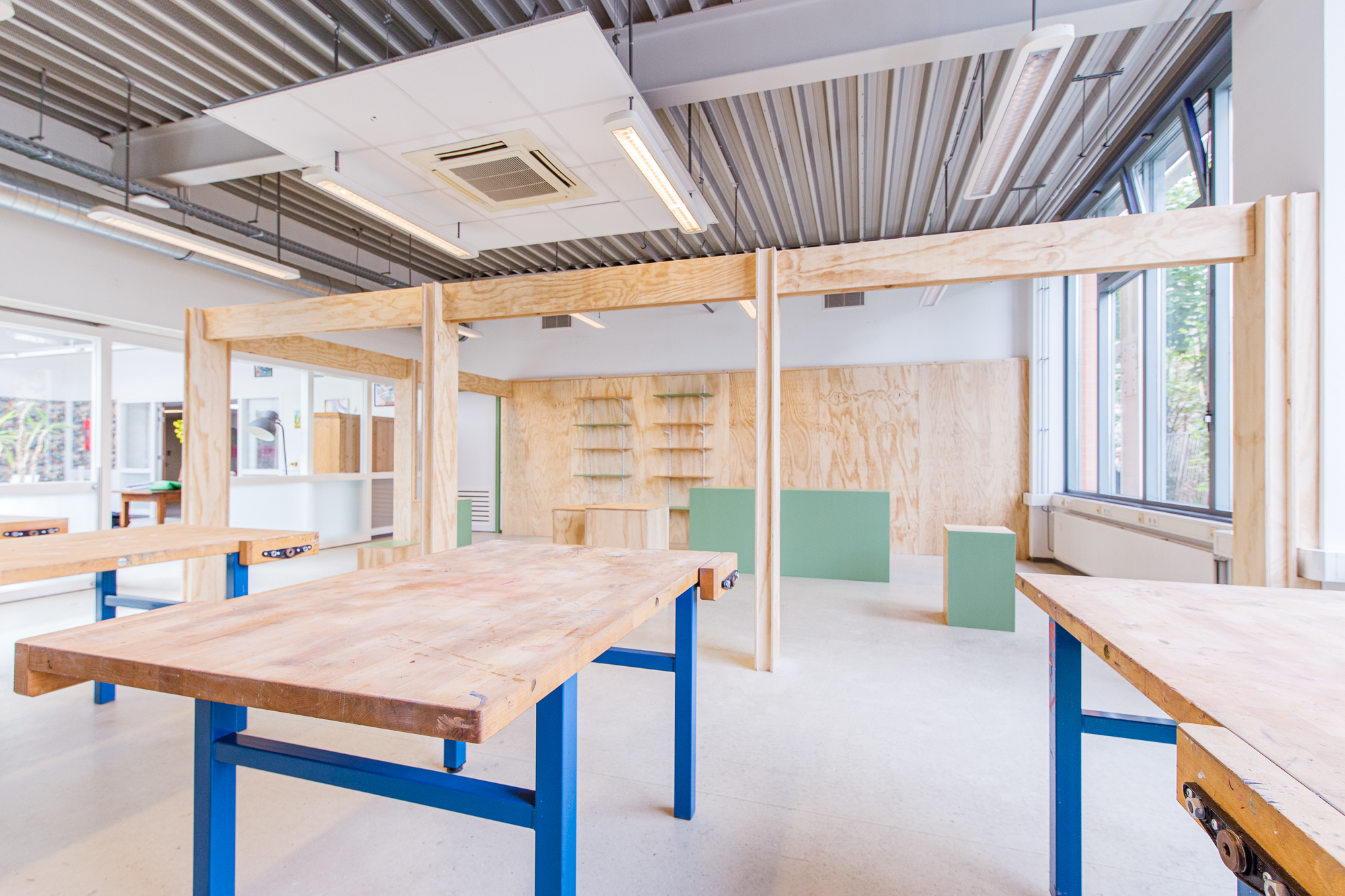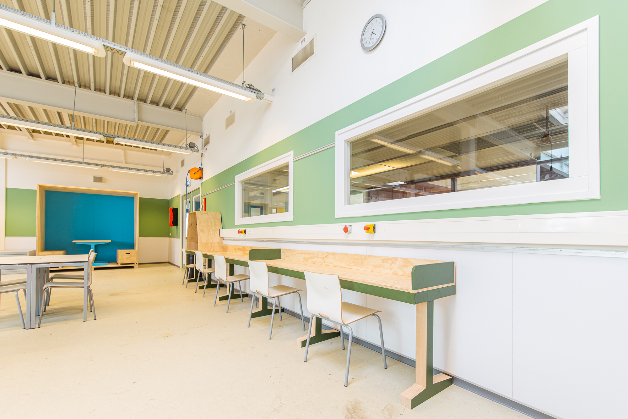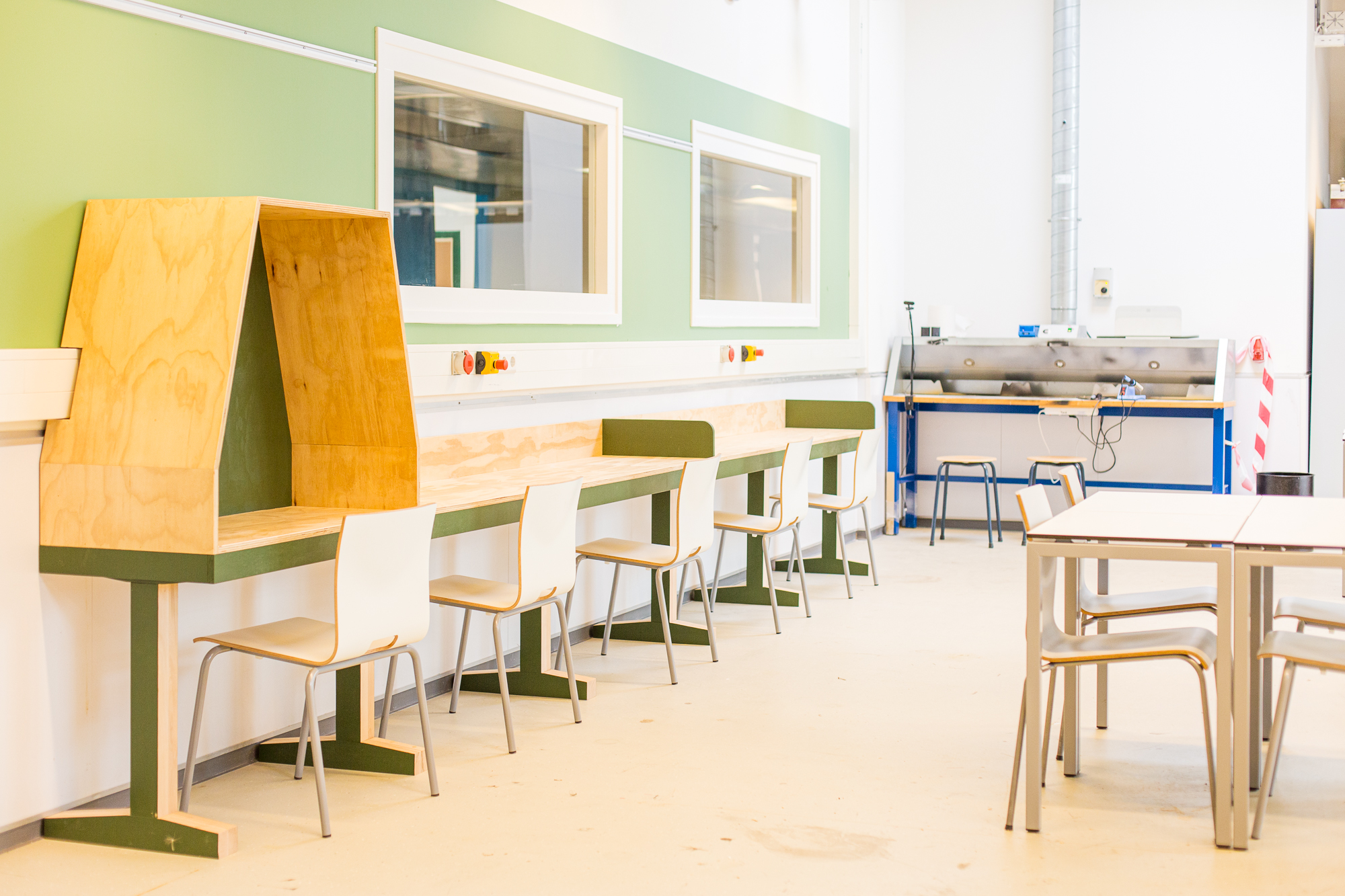 Het grote leer- en doeplein is de centrale plek van de vleugel. Hier hebben we verschillende studie- en samenwerkplekken ontworpen: een lange tafel tegen de muur, ronde hoge tafels rond een aantal pilaren, niszitjes met tafel, banken met hoge leuningen en een aantal gewone tafels. In dezelfde ruimte hebben we een hele grote, hoge samenwerkbank geplaatst, een perfect plek voor zowel uitleg over een project als het samenwerken of samenbrengen van verschillende onderdelen gemaakt in de omliggende werkplaatsen (hout, elektra & atelier). In het ‘huis’ hebben we de vier functies (keuken, slaapkamer, woonkamer, eetkamer) ieder in een hoek realistisch neergezet. De winkel is een meer abstracte ruimte, waar leerlingen zelf nog hun eigen draai aan kunnen geven. Is het kledingwinkel, supermarkt of telefoonshop? Alles om zo levensecht mogelijk onderwijs aan te bieden.