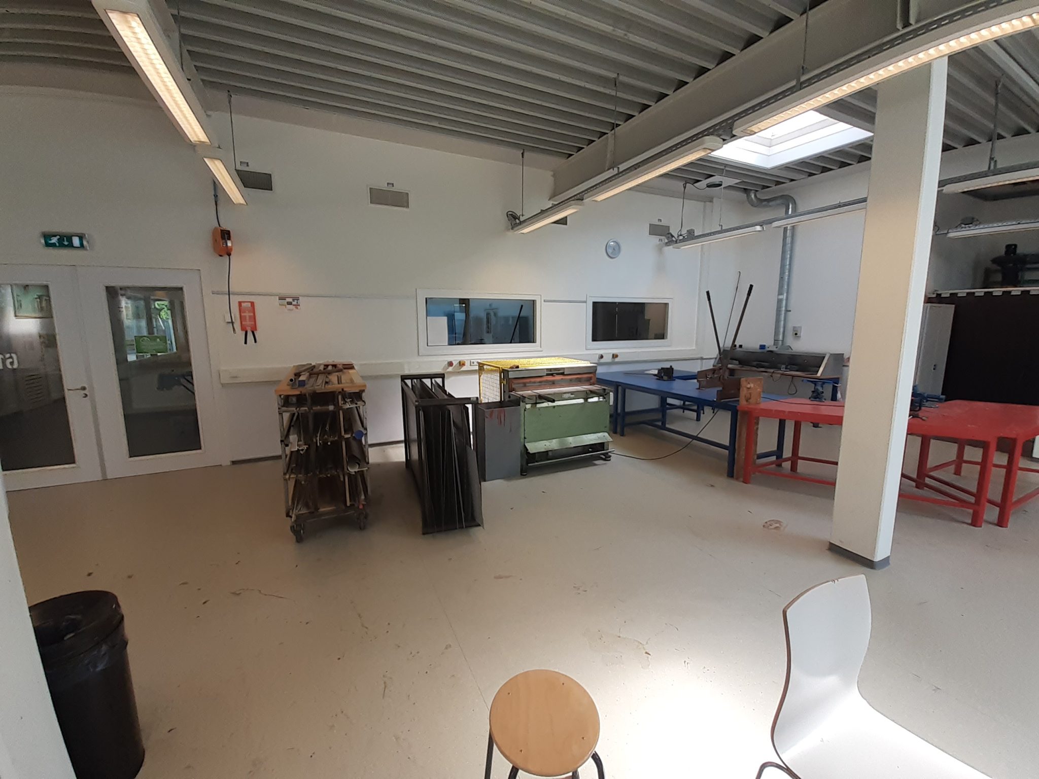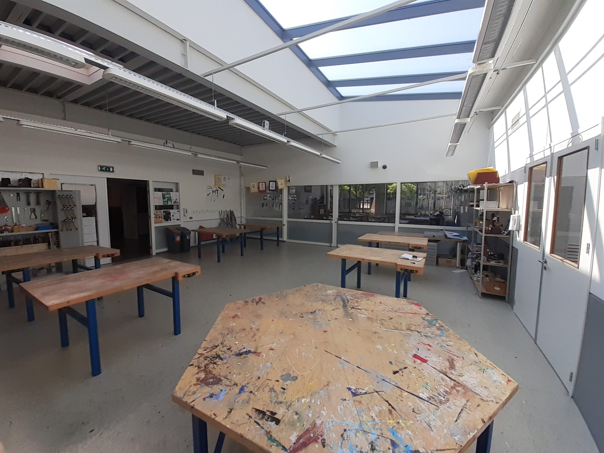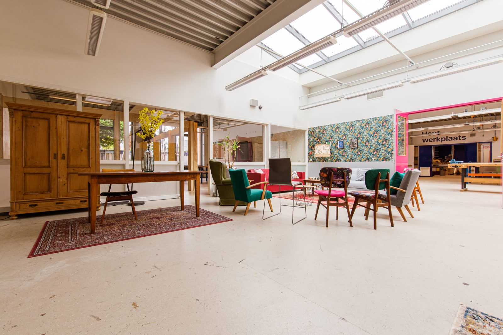 Het grote leer- en doeplein is de centrale plek van de vleugel. Hier hebben we verschillende studie- en samenwerkplekken ontworpen: een lange tafel tegen de muur, ronde hoge tafels rond een aantal pilaren, niszitjes met tafel, banken met hoge leuningen en een aantal gewone tafels. In dezelfde ruimte hebben we een hele grote, hoge samenwerkbank geplaatst, een perfect plek voor zowel uitleg over een project als het samenwerken of samenbrengen van verschillende onderdelen gemaakt in de omliggende werkplaatsen (hout, elektra & atelier). In het ‘huis’ hebben we de vier functies (keuken, slaapkamer, woonkamer, eetkamer) ieder in een hoek realistisch neergezet. De winkel is een meer abstracte ruimte, waar leerlingen zelf nog hun eigen draai aan kunnen geven. Is het kledingwinkel, supermarkt of telefoonshop? Alles om zo levensecht mogelijk onderwijs aan te bieden.