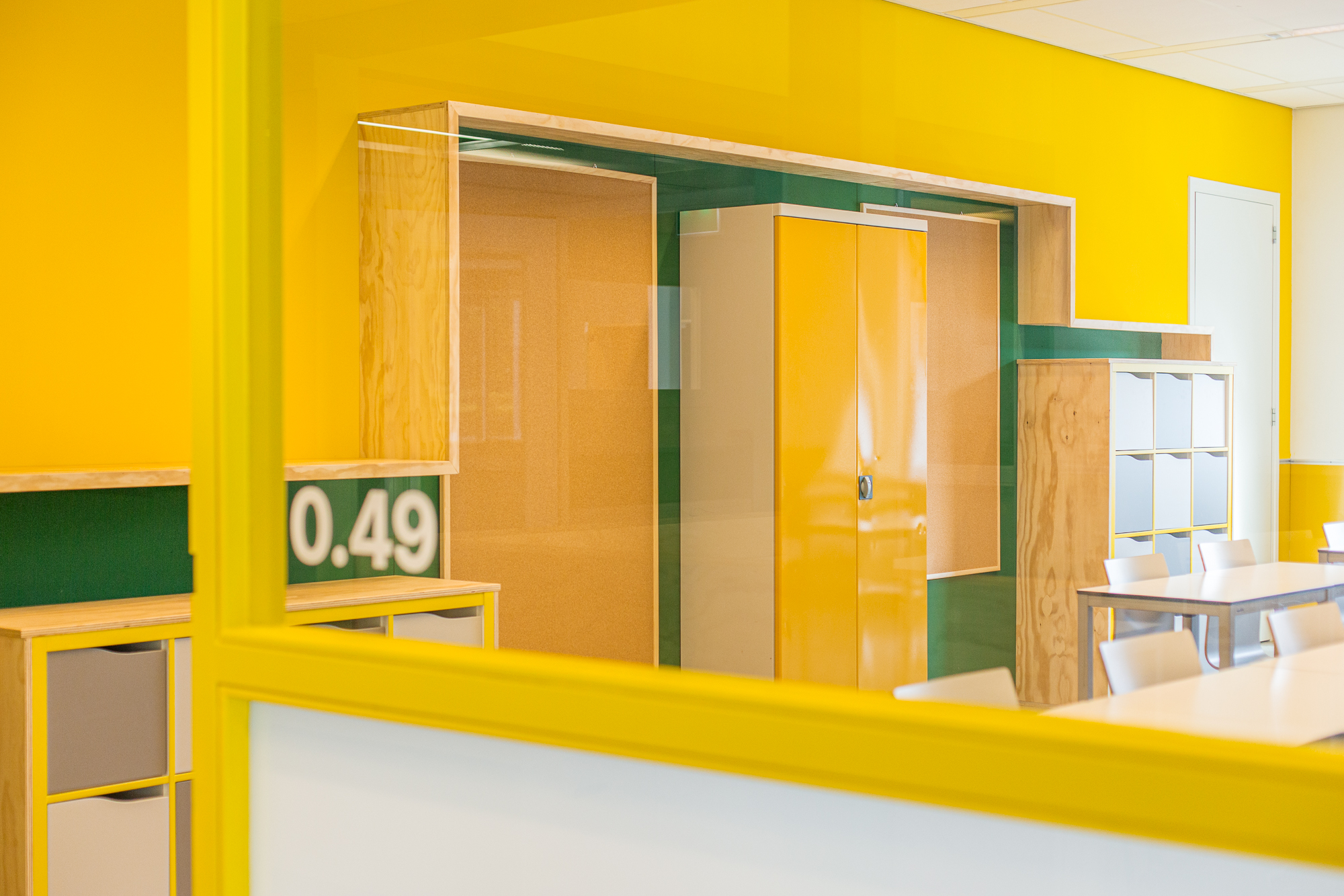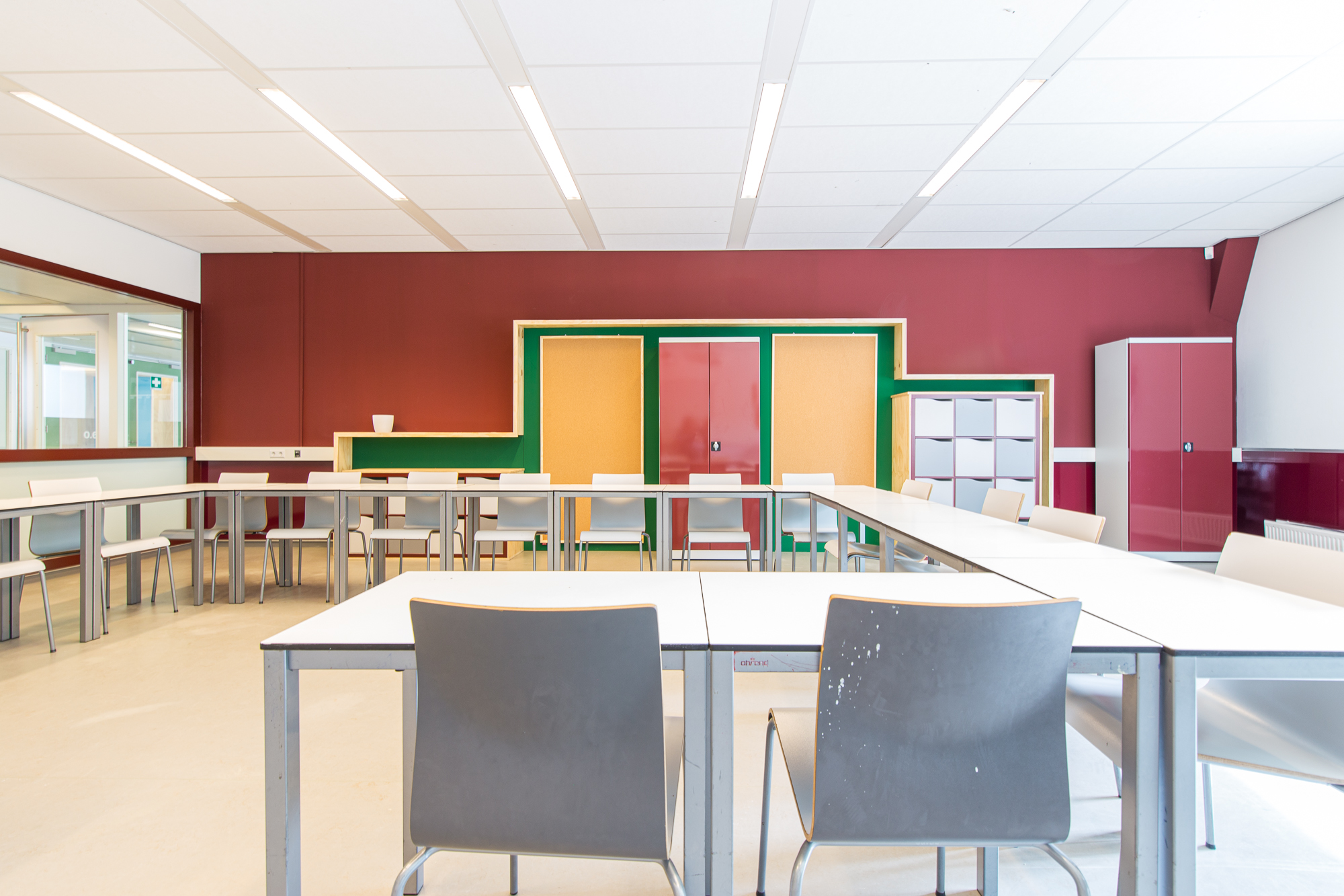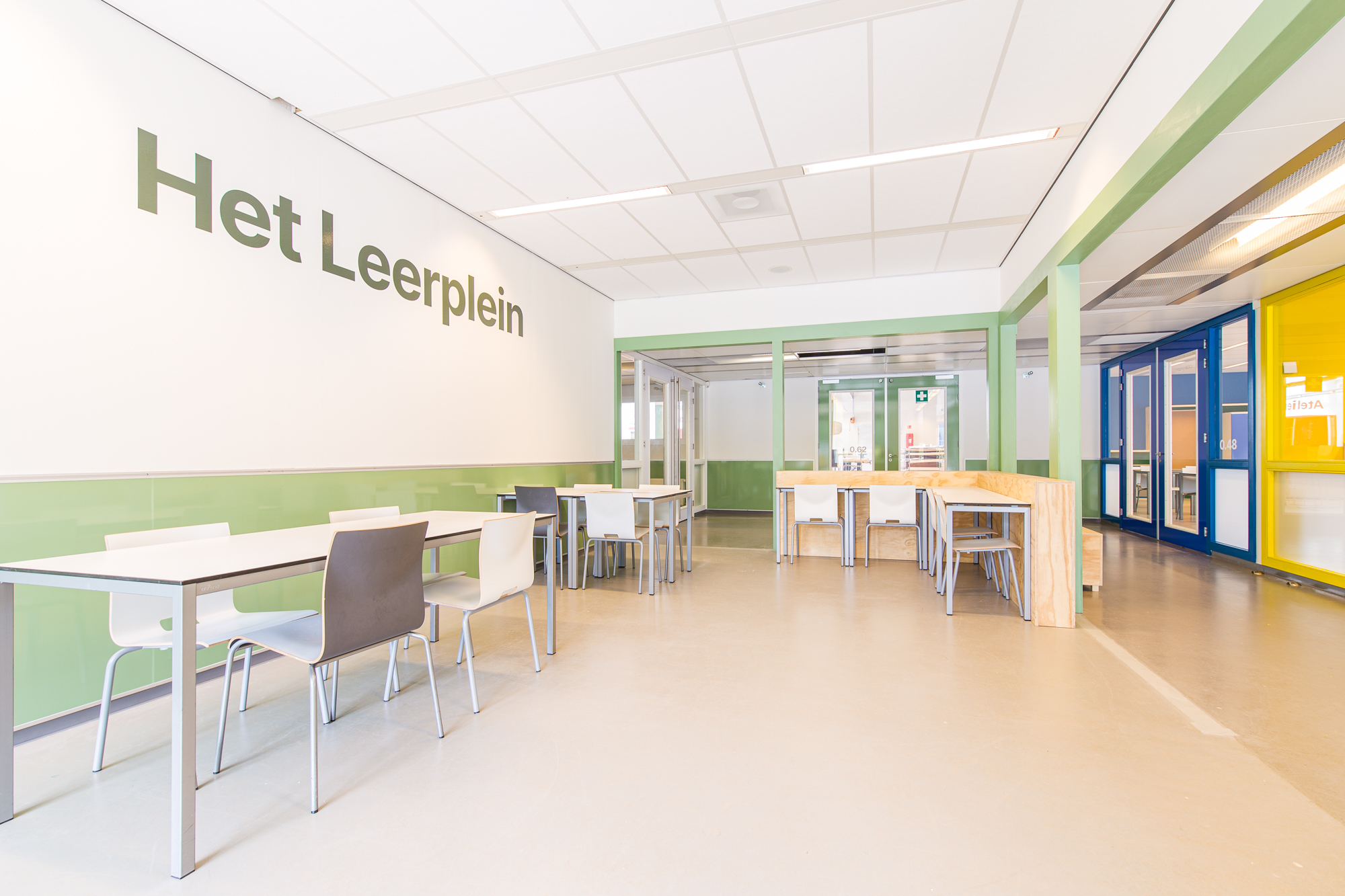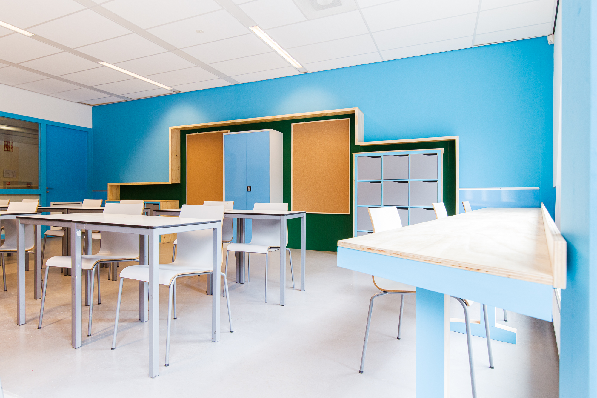 De vijf stamlokalen hebben ieder een eigen karaktervolle frisse kleur: deuren, kozijnen en wanden. Ieder lokaal heeft tegen de achterwand een lokaalbrede stamkast. De praktische plek voor materialen en spullen van leerlingen, maar ook voor het opprikken van poster, flyers, foto’s en het uitstallen van werkstukken, inspirerende boeken of andere toffe items. Ieder lokaal heeft een lang bureau voor het raam om een aantal lichte studieplekken te creëren. Op de beide pleinen hebben we juist een rustigere kleur gebruikt en ook de meubels daar zijn gemaakt van transparant behandeld hout, met een rustige uitstraling.
