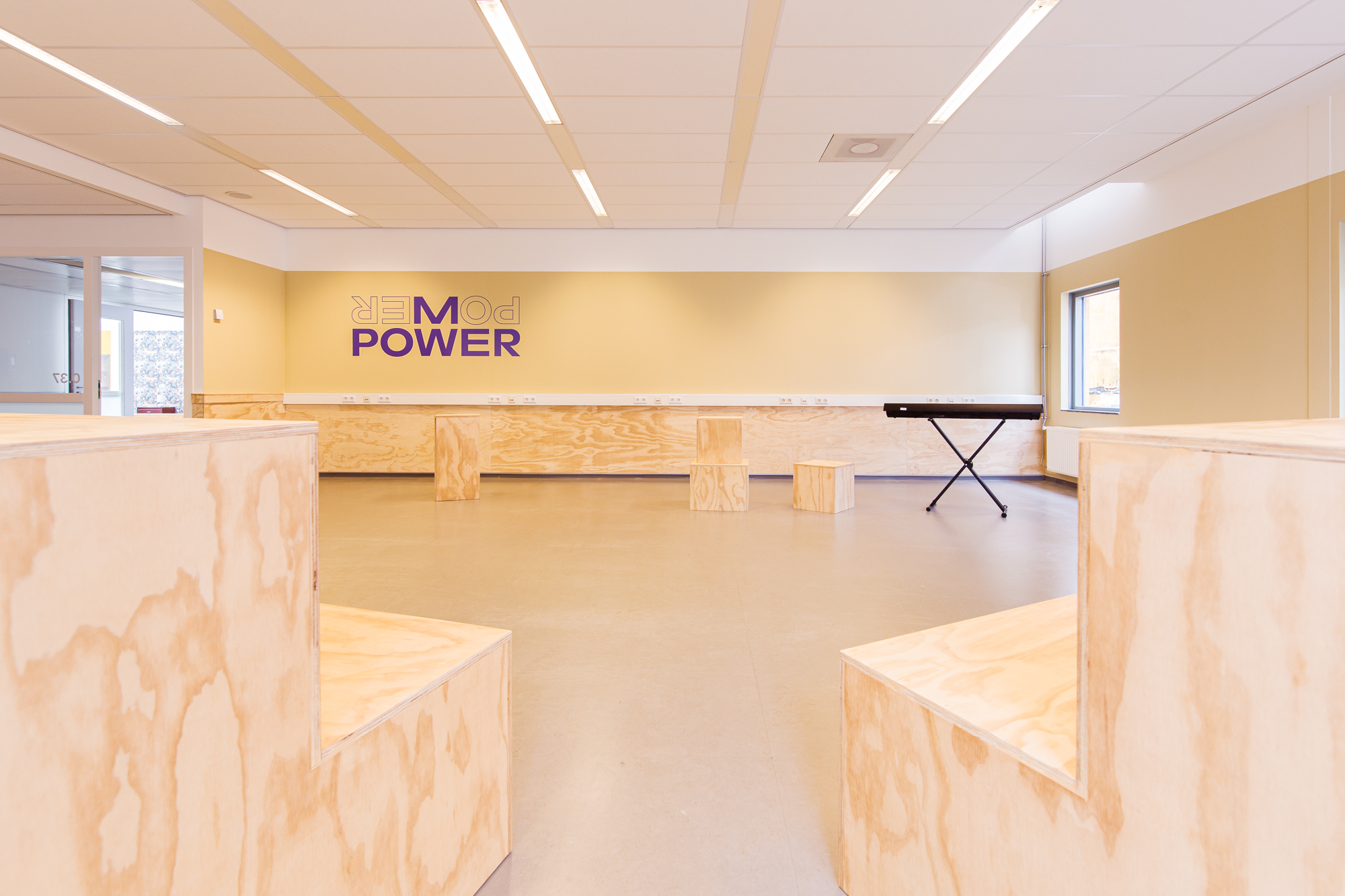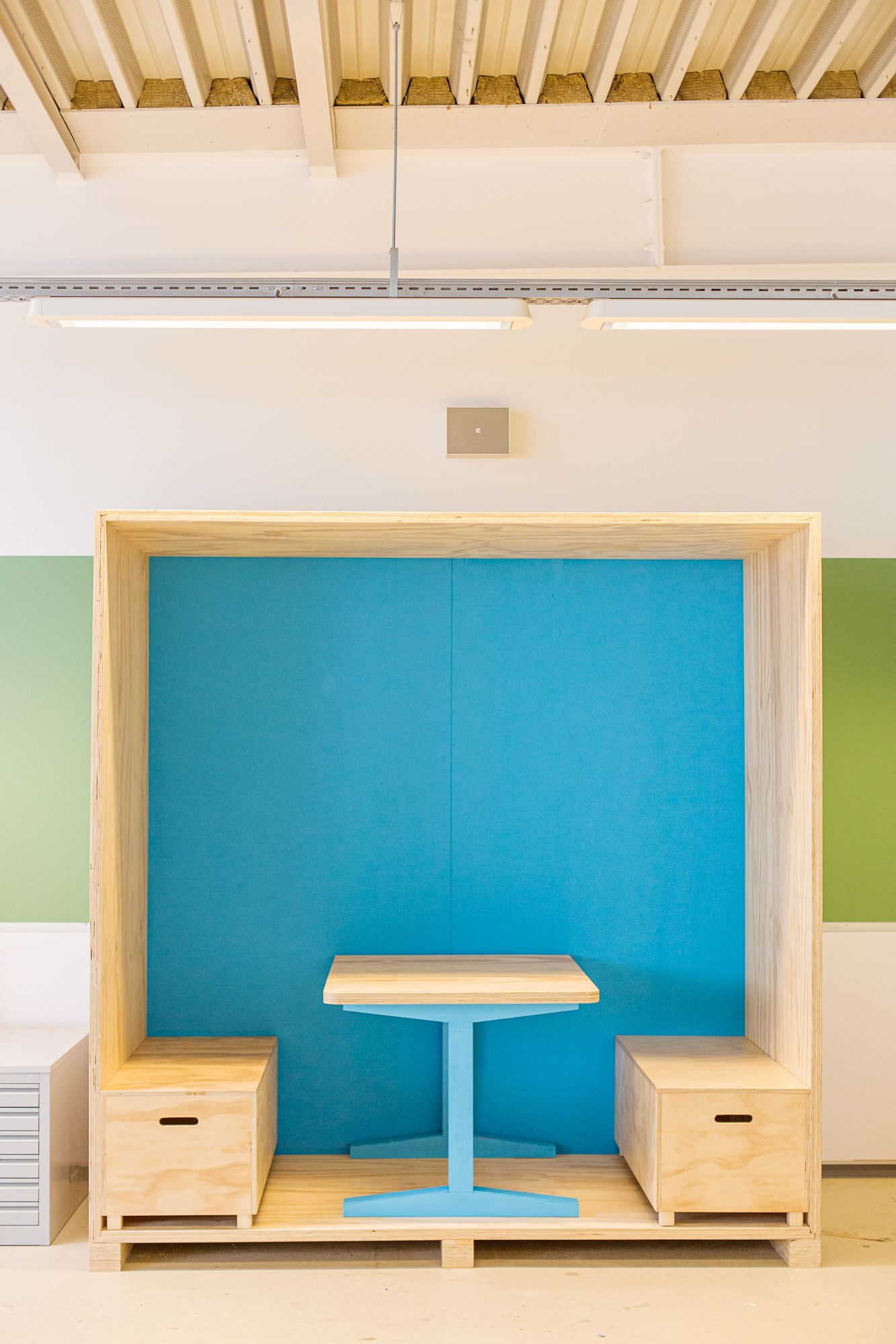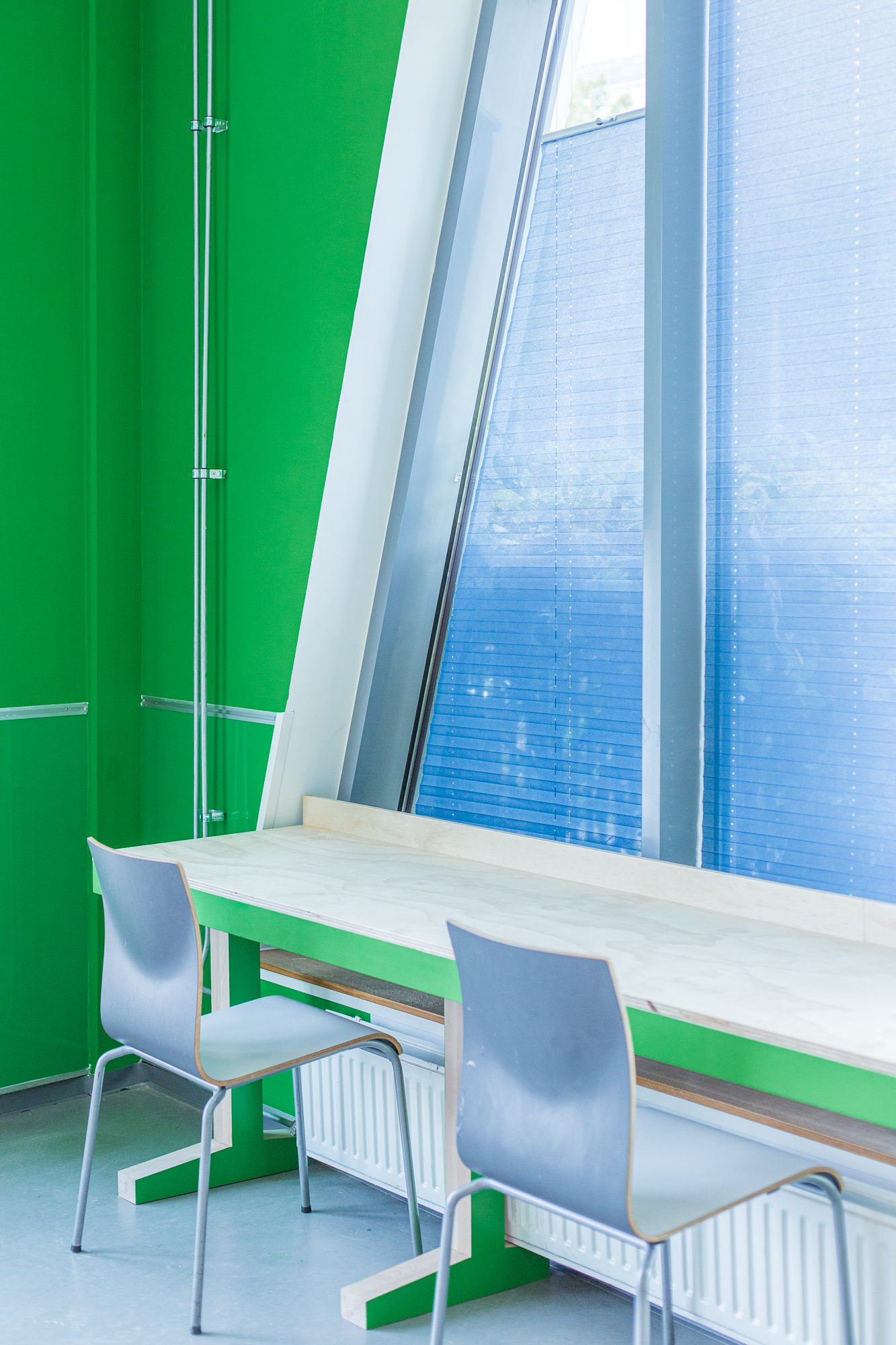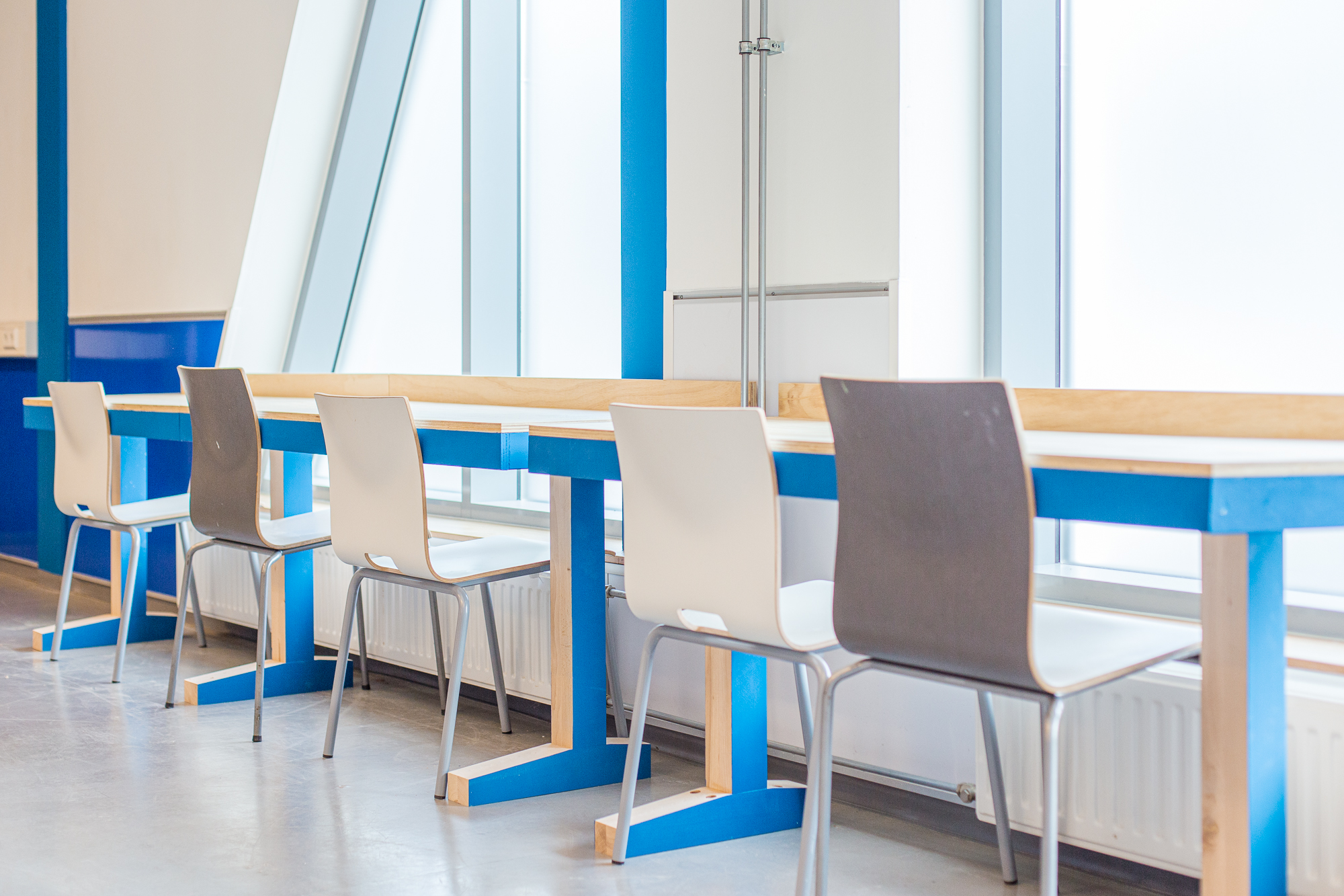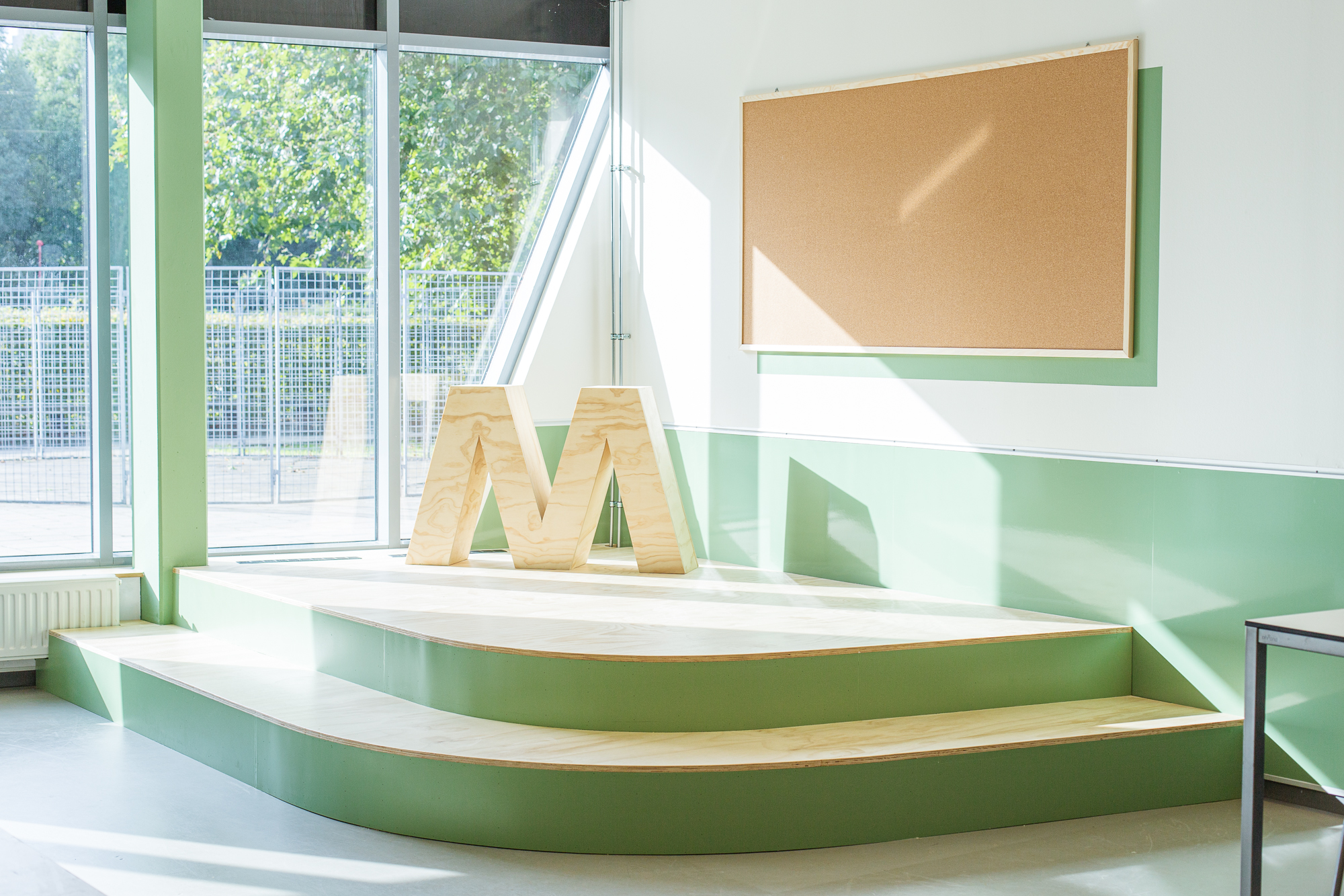 De vijf stamlokalen hebben ieder een eigen karaktervolle frisse kleur: deuren, kozijnen en wanden. Ieder lokaal heeft tegen de achterwand een lokaalbrede stamkast. De praktische plek voor materialen en spullen van leerlingen, maar ook voor het opprikken van poster, flyers, foto’s en het uitstallen van werkstukken, inspirerende boeken of andere toffe items. Ieder lokaal heeft een lang bureau voor het raam om een aantal lichte studieplekken te creëren. Op de beide pleinen hebben we juist een rustigere kleur gebruikt en ook de meubels daar zijn gemaakt van transparant behandeld hout, met een rustige uitstraling.